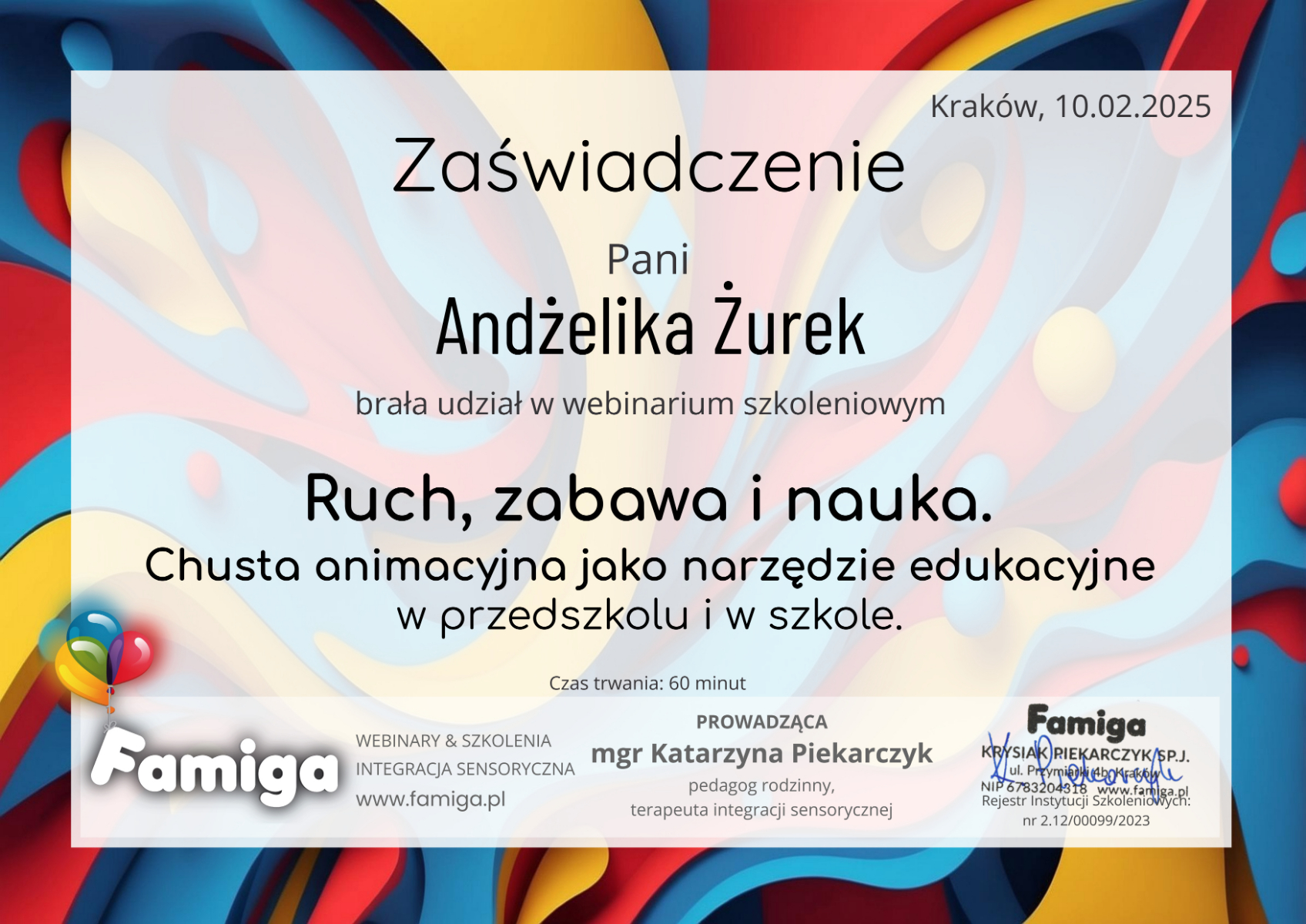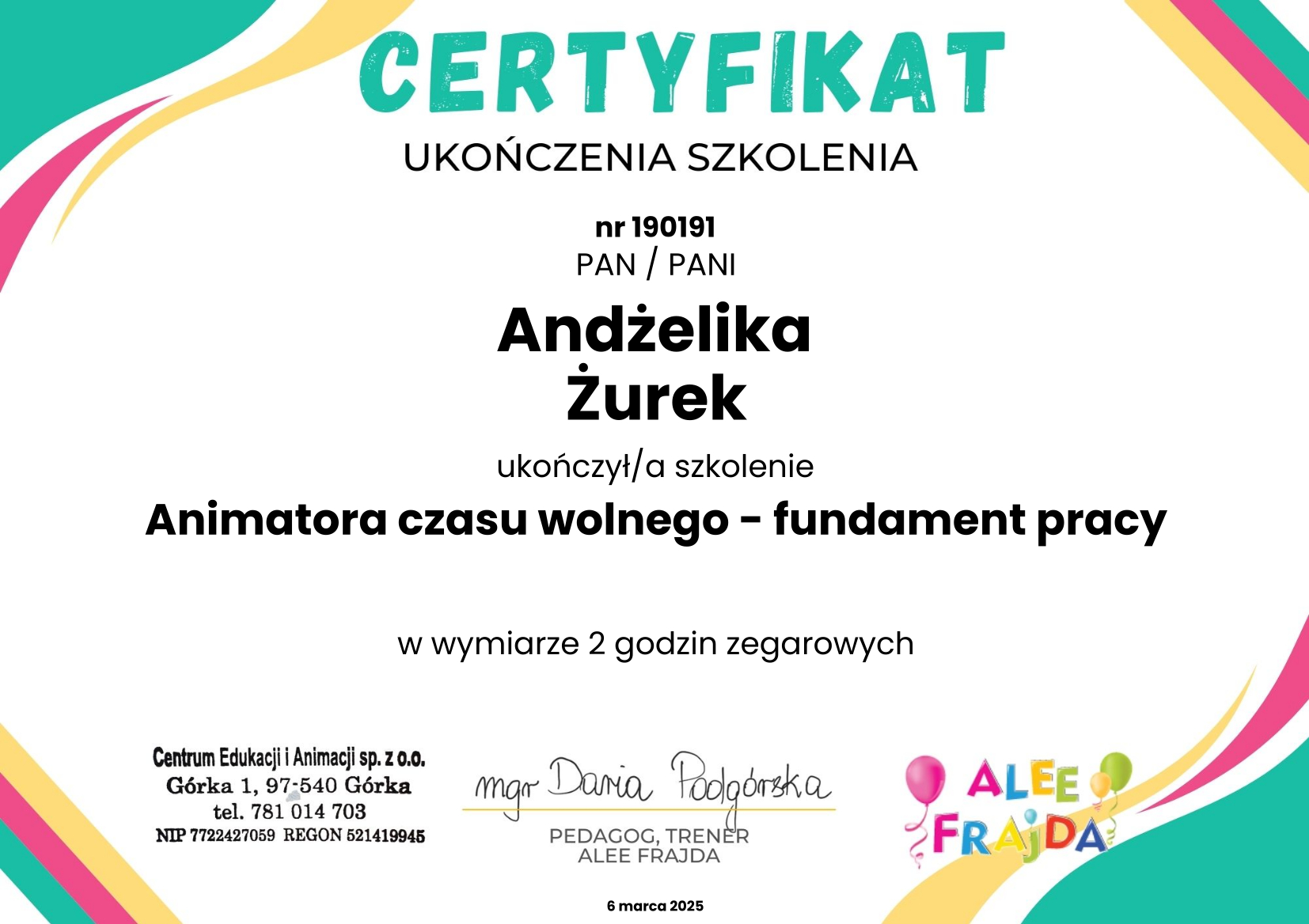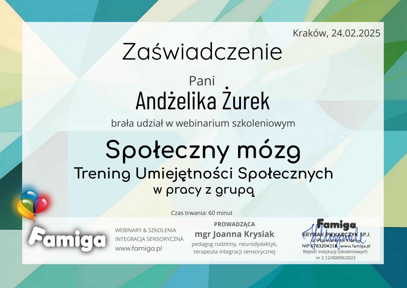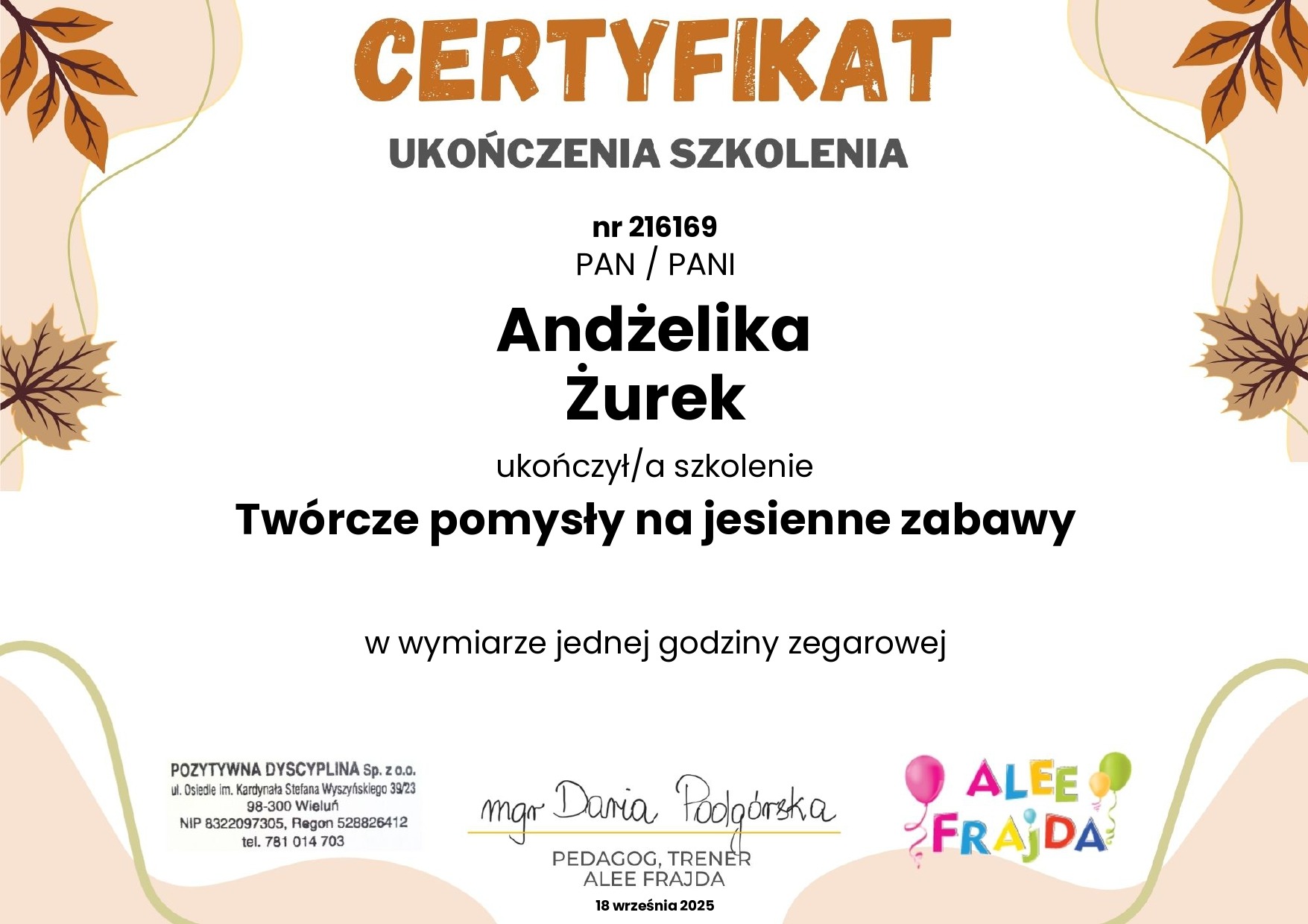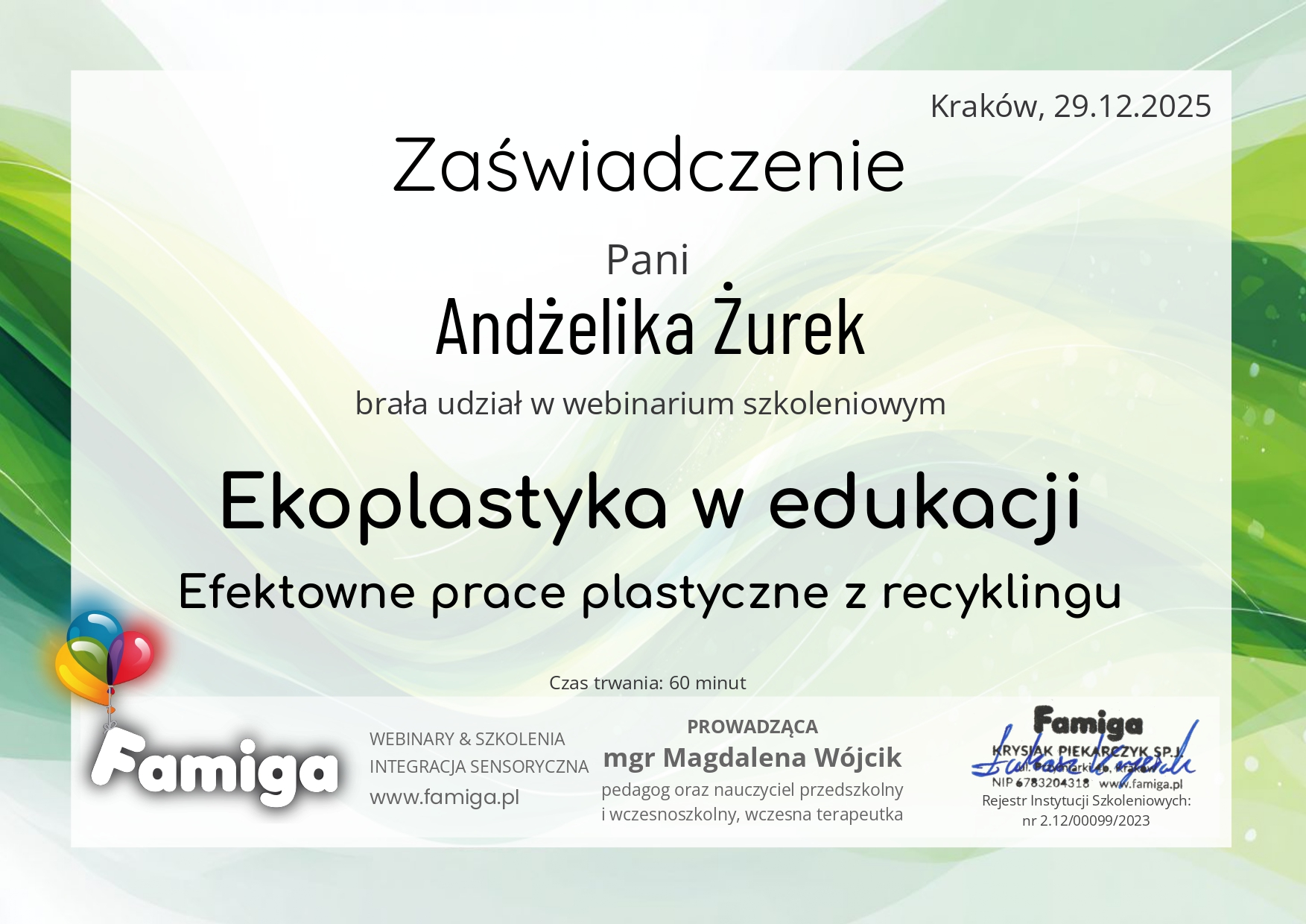 Chciałabym podzielić się z Wami moimi osiągnięciami w rozwoju zawodowym. Zdobyłam szereg certyfikatów i ukończyłam wartościowe szkolenia, które poszerzyły moje kompetencje. Jestem dumna z mojego zaangażowania w ciągłe doskonalanie się.